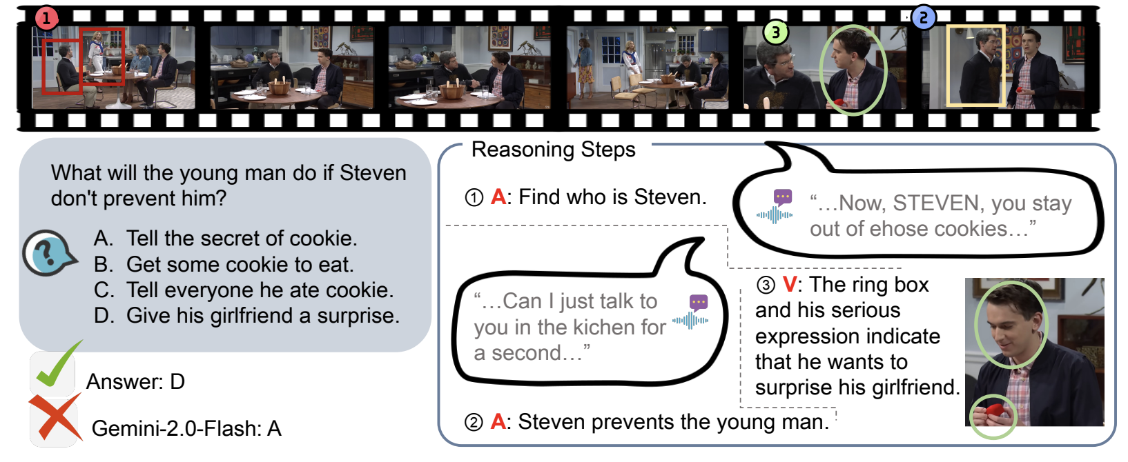 - 문항 구성: 1,000개 QA를 13개 과제 유형(시공간 추론, 인과, 카운팅, 배경·음악 이해 등)으로 작성하고, 단계별 추론 체인(모달리티·증거·추론)을 인력으로 부착.