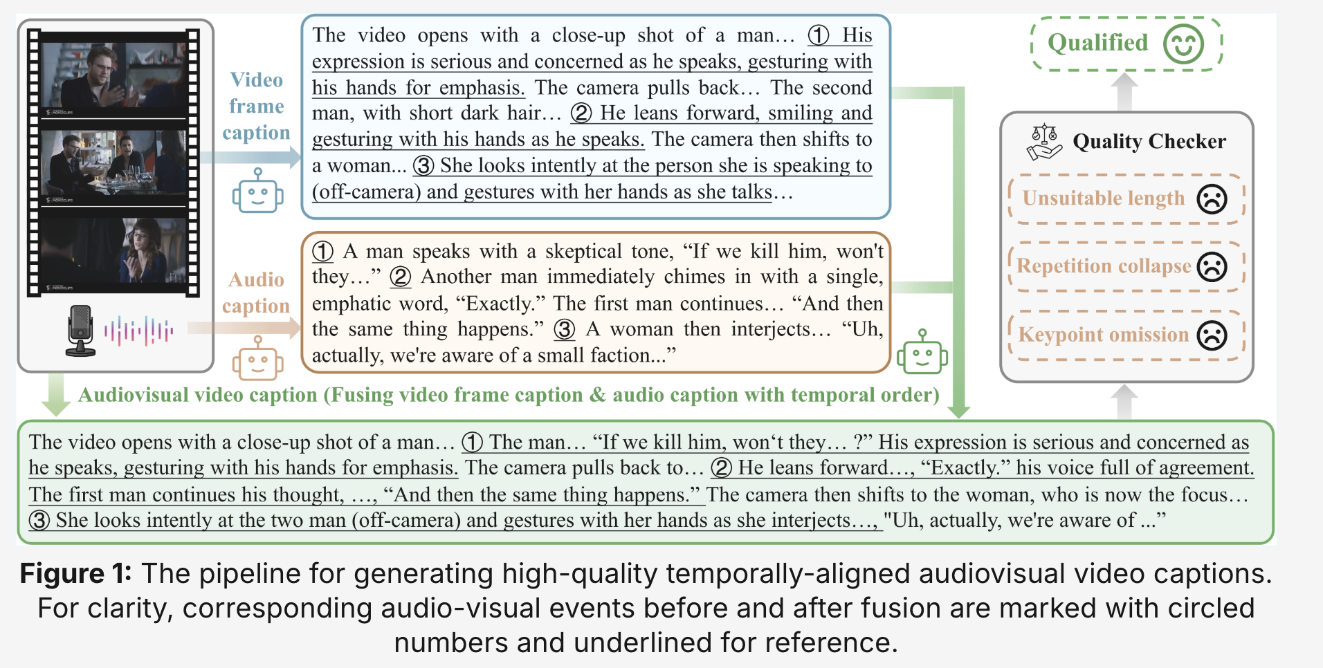 - 두 단계 캡션 제작: (1) 비디오/오디오를 각각 캡션화 → (2) 원본 영상과 함께 시간 정합된 단일 AV 캡션으로 재합성.
