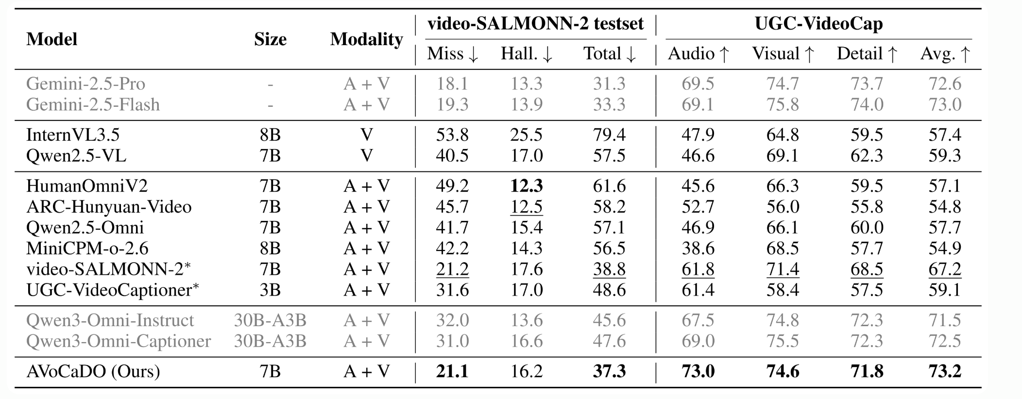 AVoCaDO는 영상+오디오(AV)를 시간적으로 맞물리게(temporal orchestration) 서술하는 캡셔닝 모델. 107K AV 캡션 SFT와 GRPO 보상 3종(체크리스트, 대화 정확도, 길이 정규화)로 학습해, 여러 AV 캡셔닝 벤치마크에서 오픈소스 SOTA 및 일부 상용 모델 수준까지 도달.