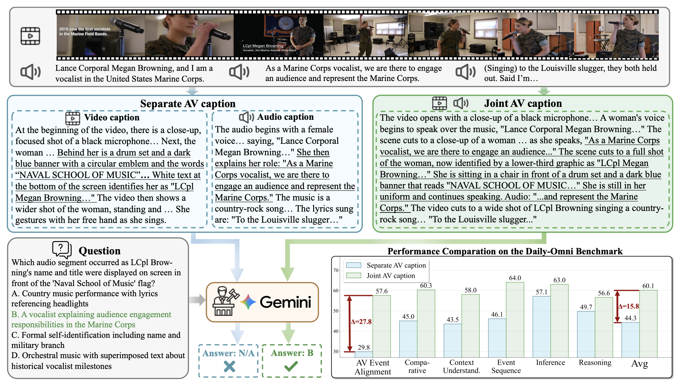- 파일럿 실험: 공동 처리(AV joint caption)가 분리 후 연결 대비 +15.8%, 특히 AV 이벤트 정합 과제에서 +27.8% 향상. → AV 동시·정합 캡션이 성능의 핵심.