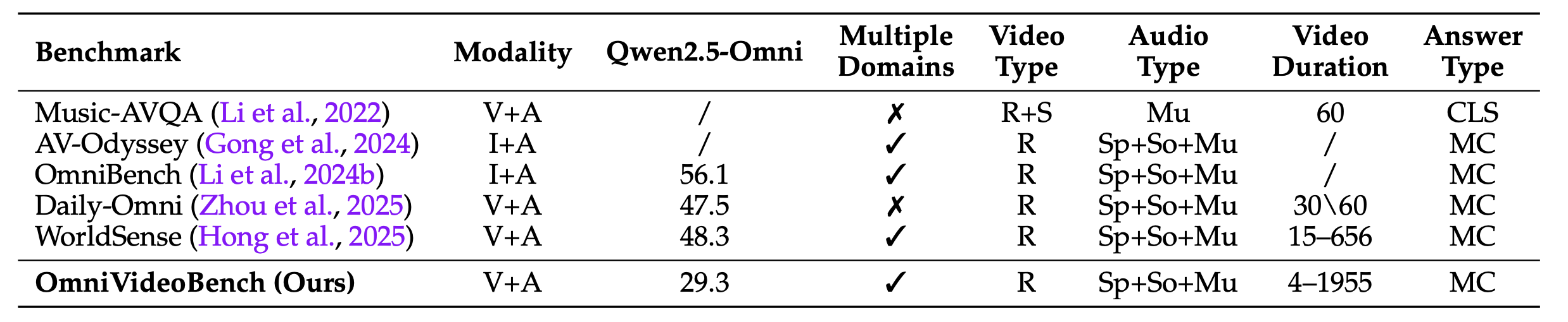 - 기존 AV-Odyssey·OmniBench 등 이미지 기반 또는 짧은 클립 중심 평가 대비, OmniVideoBench는 수초~30분 실영상을 다루며 도메인 다양성과 오디오 유형을 폭넓게 포함.