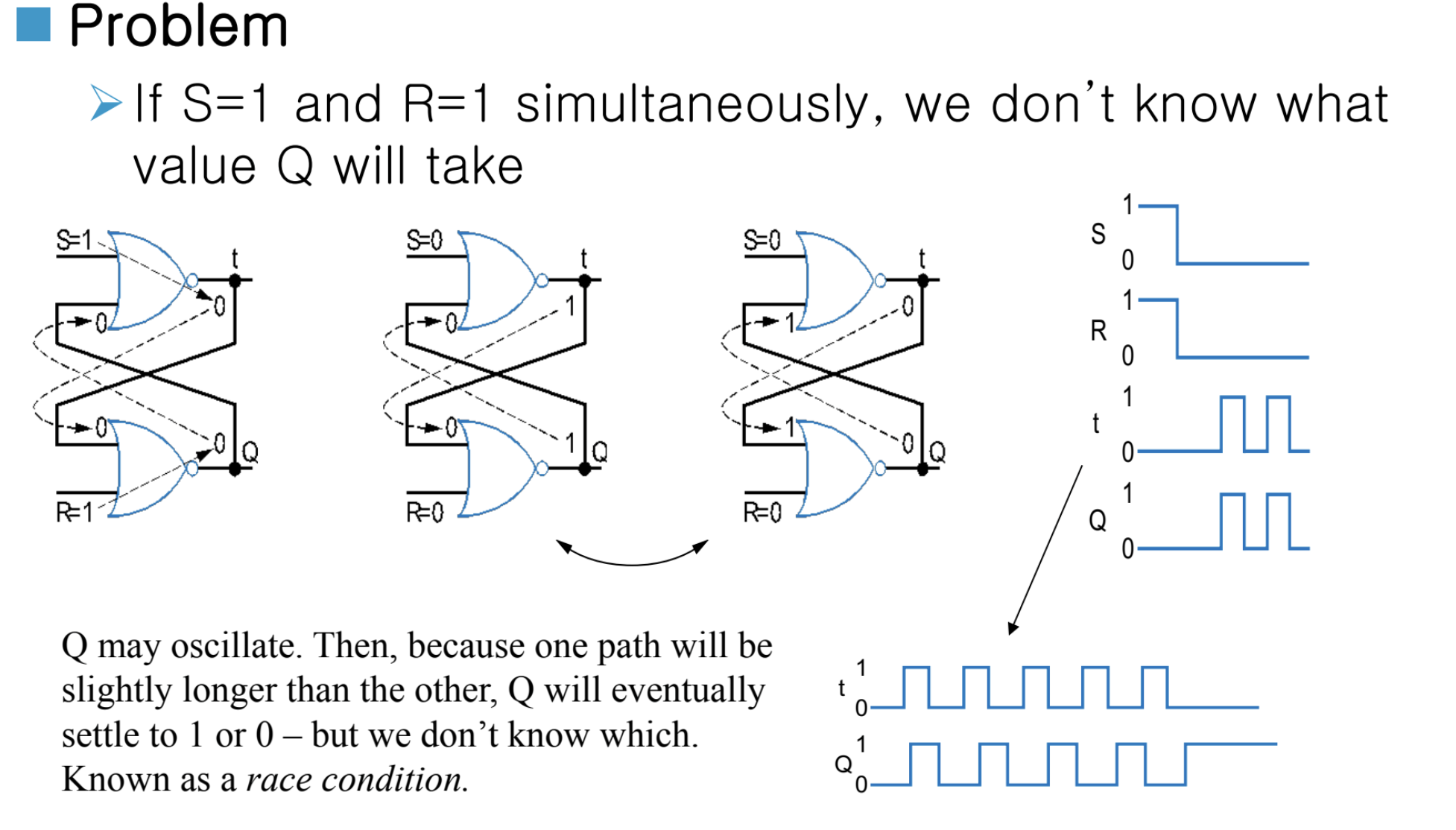 앞에서 배운 SR latch(두 개의 교차 NOR 게이트)는 Set과 Reset이 가능했지만, “둘 다 1이 되면 어떻게 될까?” 하는 상황이 바로 여기야.