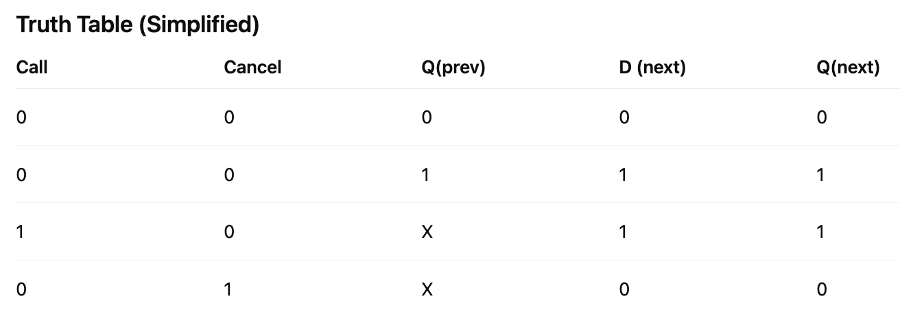 | Sequential Circuit | Output depends on present inputs + past inputs (state). |
