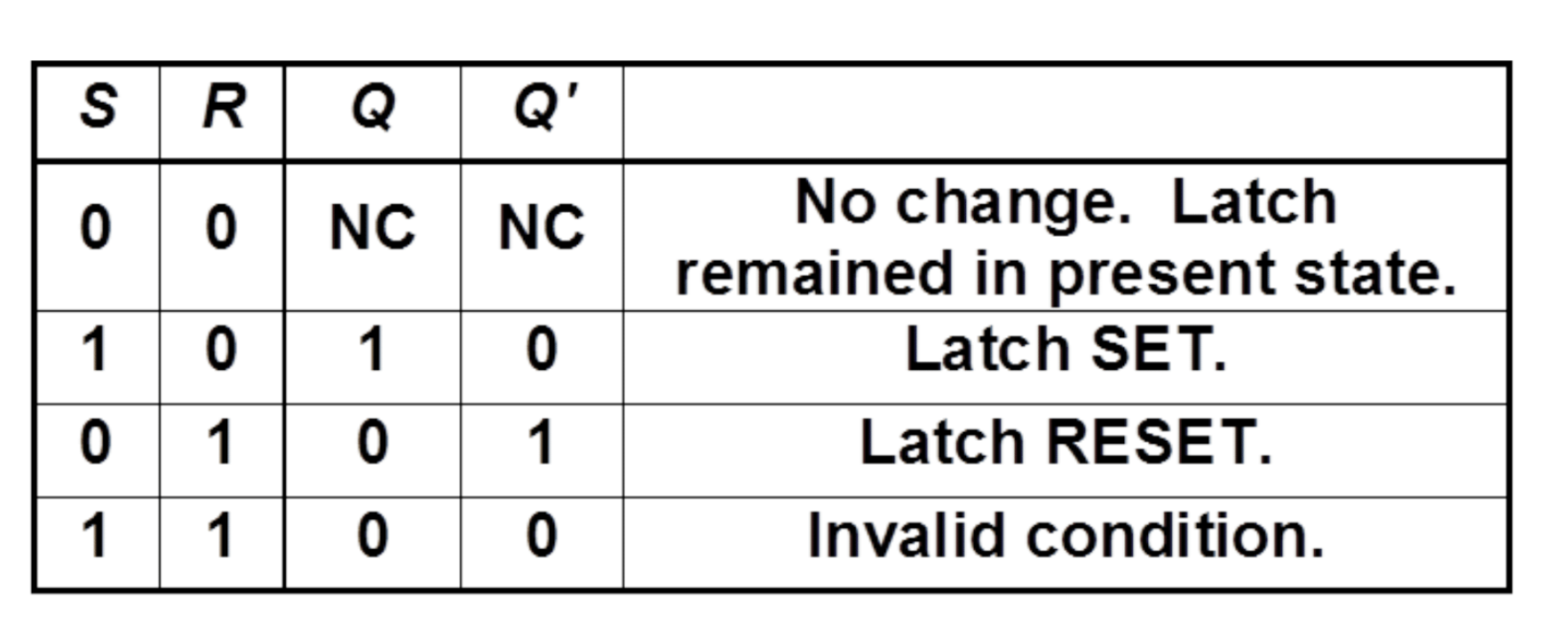 - 단, S=R=1이면 두 게이트가 동시에 0으로 출력되며 불안정(경쟁 상태) 발생.